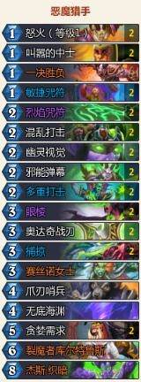 卡组:怒火x2+叫嚣的中士x2+一决胜负+敏捷咒符x2+混乱打击x2+幽灵视觉x2+邪能弹幕x2+多重打击x2+眼梭x2+奥达奇战刃x2+捕掠x2+赛丝诺女士+爪刃哨兵+无底海渊+贪婪需求x2+裂魔者库尔特鲁斯+杰斯·织暗