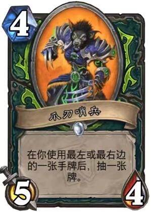 【爪刃哨兵】带了一张,这个随从有高质量身材的同时还可以帮助我们刷牌是非常厉害的,只要给到【爪刃哨兵】一定的减费,我们在中期可以靠这个随从刷很多牌,是一个强大的过牌手段。
