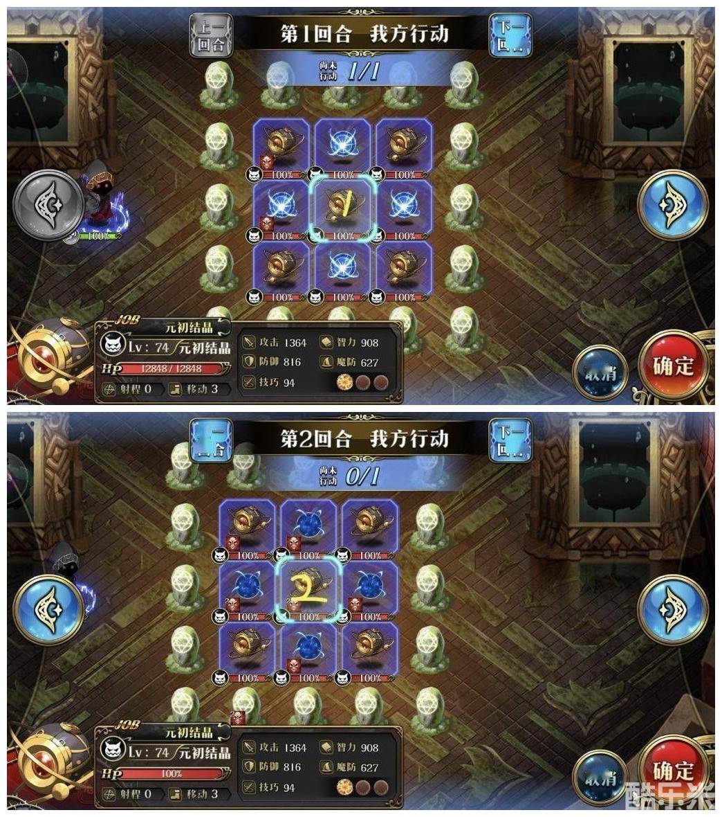 第二波,顶层有个电球自带1层debuff,在它下面的机械球上释放1技能,这个机械球下面的另一个机械球上释放2技能,再给第一个机械球释放1技能结束。