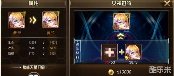 进阶,通过消耗进阶卡和对应女神碎片+金币进行进阶,进阶同时会开启对应的技能天赋