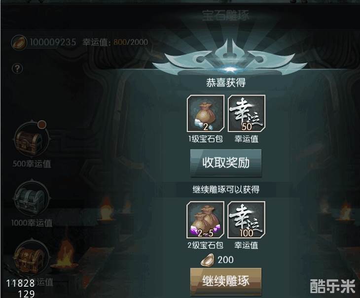 4、幸运值可以开启左侧的幸运箱子,幸运箱子开启后可获得大量高级宝石