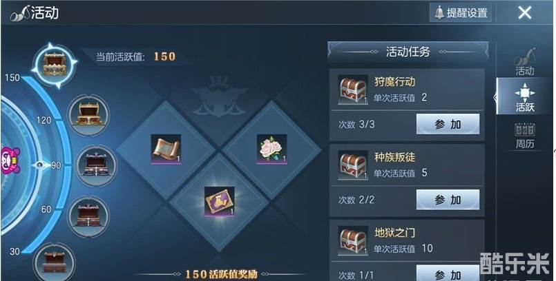 完成日常活动中的各个活动都会获得每日活跃值,当活跃值达到特定要求的时候,就可以领取活跃度奖励。活跃度奖励中包含可以爆出稀有道具的藏宝图,另外还有大量的外观碎片。所以每日做满活跃值是必须的事情!