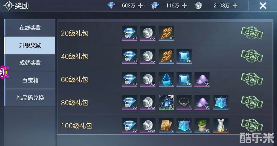 角色等级达到特定的级别即可领取奖励。等级越高,奖励越好。而且还有珍贵的变身卡、橙装等奖励哦。