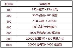 【活动内容】活动期间,每消费1000金币,即可获得100好运值,累计获得好运值可开启奖励宝箱。