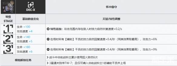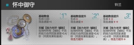 铃兰的升级模组非常奇怪,身为辅助,升级模组竟然增加辅助干员的攻击力(拿去拐红蒂吗?),而且自身的大招是无伤害技能,不够二技能在保全有高光。