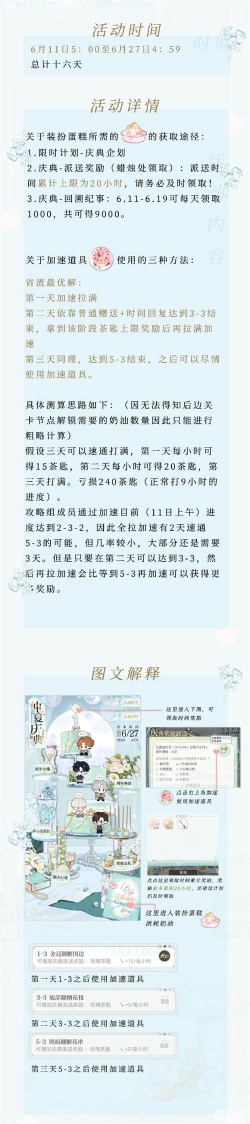 今天正常进度能到3-3,快的今天到4-1或者4-2,没到3-3可能是敲蛋糕太非了,或者1-3没弄好。不过不用着急,这个游戏时间很长,记得及时收取鎏金奶油,不要浪费。到5-3需要鎏金奶油太多了,时间大概要5-7天。真的不用着急,活动时间有整整16天!具体玩法看下面图片,非常仔细: