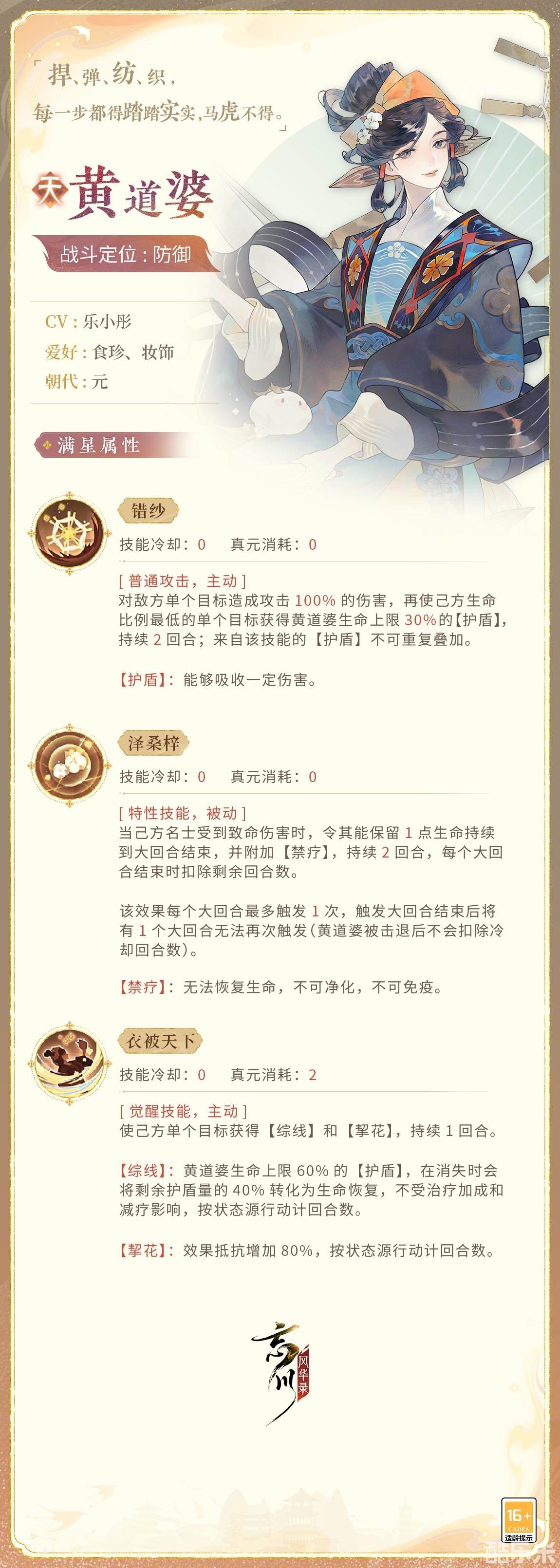 黄道婆在战斗中作为防御出战!她以技能【错纱】为普通攻击,【泽桑梓】为特性技能,【衣被天下】为觉醒技能,触发羁绊时护盾量最高提升10%,效果抵抗增加效果最高提升10%,乌泥泾被,粲然若写!