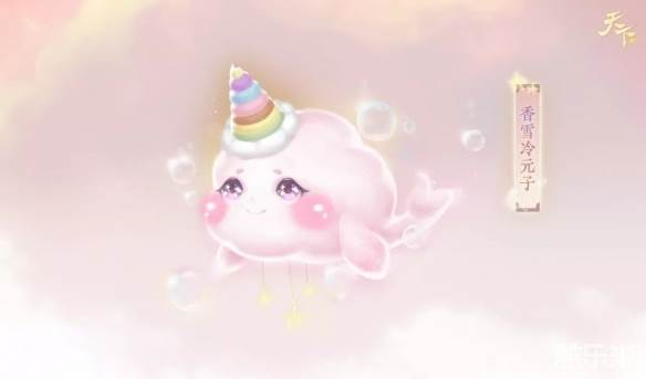 坐骑【香雪冷元子】形如桃粉云朵,彩虹独角搭配双翅鱼尾显得可爱俏皮,额上的独角变幻成了冰淇淋的模样,周身充盈梦幻气泡,水灵扑闪的大眼睛如同彩虹般绚丽,好不软萌。