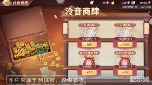 3、周年音律助力包:含音律福袋*1,元宝*120,售价12元人民币,每日限购1次;