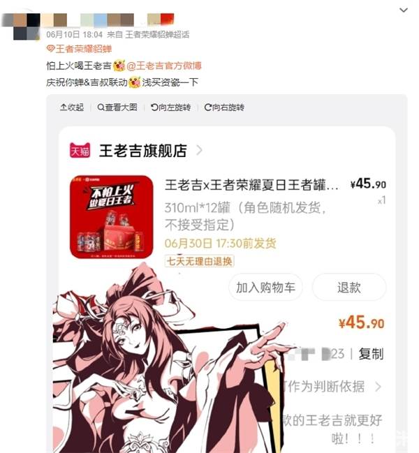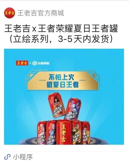 本着跟风心态(不是)好奇心围观了一下,发现原来王老吉最近跟《王者荣耀》跨界合作了!而且还专门为玩家设计了两款游戏主题的定制罐:“王老吉X王者荣耀夏日王者罐(突破系列)”和“王老吉X王者荣耀夏日王者罐(立绘系列)”。“双王”的强强联合,让众多峡谷玩家直呼“666”。