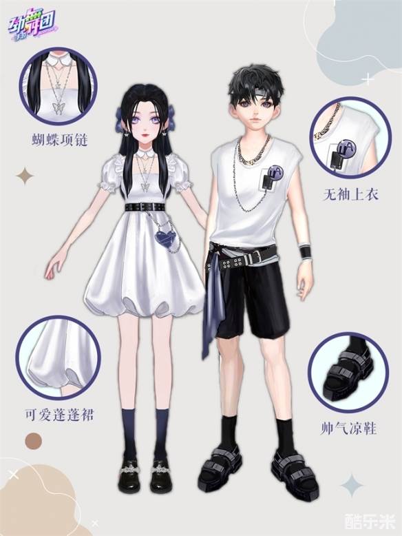 本期上新的活动服饰温柔文静/温柔娴静,男女款服饰均采用白色作为主色系。温柔娴静为一袭泡泡袖蓬裙,领口设计独具创意,露出性感锁骨;脖间叠戴精美的蝴蝶项链,闪耀动人;泡泡袖搭配褶皱花边,甜美又可爱;腰间束上皮质腰带,缀以爱心装饰的链条,柔美之中多了几分精致。这套可爱又不失性感的小清新服饰,绝对是今年夏天的绝绝子穿搭!