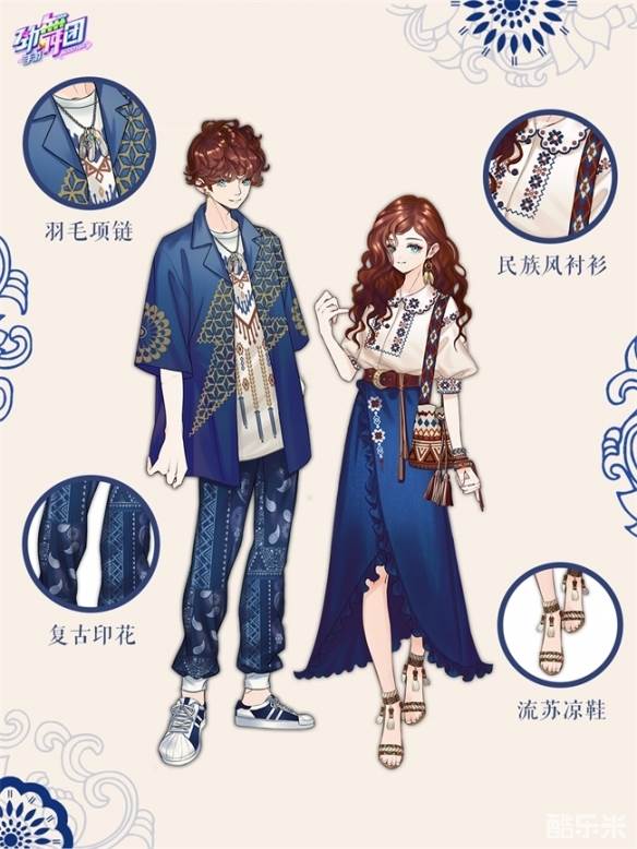 男款民族风情以藏蓝色为主色系,采用民族风刺绣上衣搭配藏蓝色衬衫外套,配上精美的羽毛项链,增添了几分随性与灵气;下装为休闲民族风长裤,配上复古印花,舒适又前卫;服饰整体搭配一顶独特吸睛的卷发,妥妥的活力异域风少年!穿戴这样一身民族气息浓郁的民族风情服饰,来AU世界尽情挥舞夏日吧!