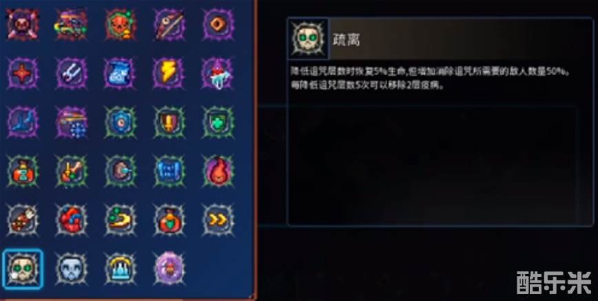 增加50%的诅咒层数,每消除一个诅咒,就会恢复5%的生命值,每降低5层变异会移除2层疫病。比如你强行开启宝箱,本来只会获得10层诅咒,但是在拥有疏离变异的情况下,会获得15层诅咒,也就是多一半诅咒层数。