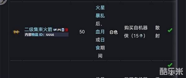 由100个三级火箭加一个蘑菇锭在锻造机合成。三级火箭的升级版,不破坏图格,范围更大总成更高伤害,用来打boss。