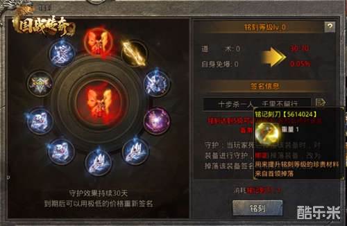 通过击杀首领已经活动可以获得铭记刻刀,可以通过消耗刻刀升级部位装备,没级提升可以增加攻击以及免爆概率,提升到5级可以对刚装备使用钻石进行签名,签名过后的装备将会被保护,掉落得时候改为掉落钻石,从而保护装备。