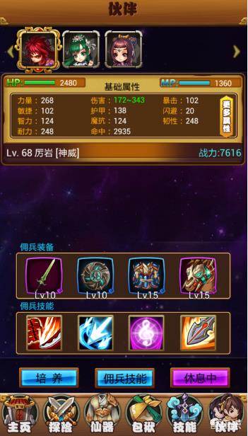 技能挂机 用的人并不多,大家可以根据自己的角色重点培养一个小伙伴就可以了。 虽然玩家雇佣小伙伴出战不用支付佣金。但是玩家却要给自己的小伙伴穿戴装备。每个职业的小伙伴都拥有四个可以穿戴装备的部位,战士职业的小伙伴可以穿戴的部位装备包括剑、盾牌、胸铠以及护腿;猎人职业的小伙伴可以穿戴的部位装备包括弓、箭筒、胸铠以及护腿;法师职业的小伙伴可以穿戴的部位装备包括杖、手册、胸铠以及护腿。玩家在挂机当中或者装备熔炼当中得到的不符合角色职业的高级装备可以给合适职业的小伙伴穿戴,这里提一下小伙伴的装备重点洗练耐力,其它属性 不是特别有要求。