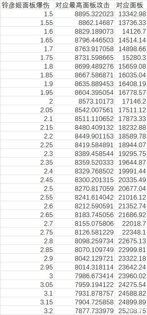 铃彦姬卡面板表格,需要尽量接近但不能超过该面板,同时尽量选高爆伤的面板配,同样卡丝血的铃彦姬,爆伤越高,给其他小怪剩下的生命越少,茨木要求越低