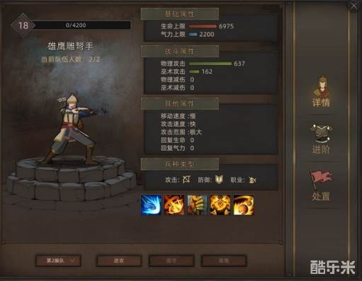 雄鹰雕弩手是部落的最高级兵种,也是他们的王牌部队。除了有着久经沙场的战斗经验以外,雕弩手还配备了特制的弩矢,能够对远处的敌人造成燃烧、穿透、减速等特殊状态,为战局制造先机,对其他部落而言是不可忽视的威胁。