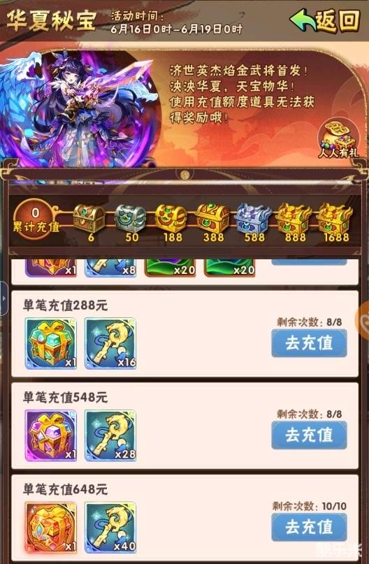 焰金武将·济世英杰重磅首发!华夏秘宝降临,解锁宝塔兑换丰厚玄金资源!每日单充惊喜不断,玄金坐骑限时返场!时空礼包登场,焰金武将皮肤上架!武将升星赠好礼,专属变装限时领!限时累充梦幻上线,「少年节限定变装--瓷蝶精怪」不容错过!定制礼包限时上架,焰金装宝、三昧灵丹任君挑选!6月16日登录更有166发连抽、珍稀变装等豪华福利等你获取!