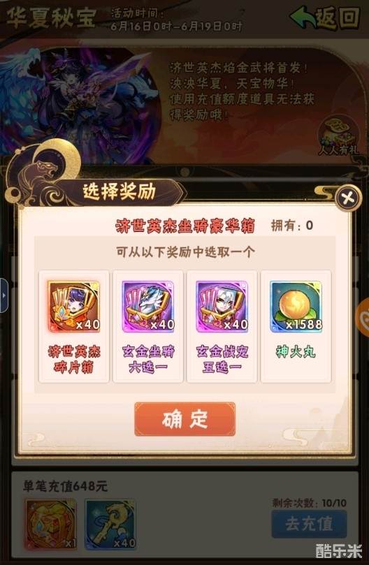 在活动期间少年们单笔充值至指定金额,即可获得济世英杰碎片箱、玄金坐骑六选一、玄金战宠五选一、神火丸、稀世秘钥等资源: