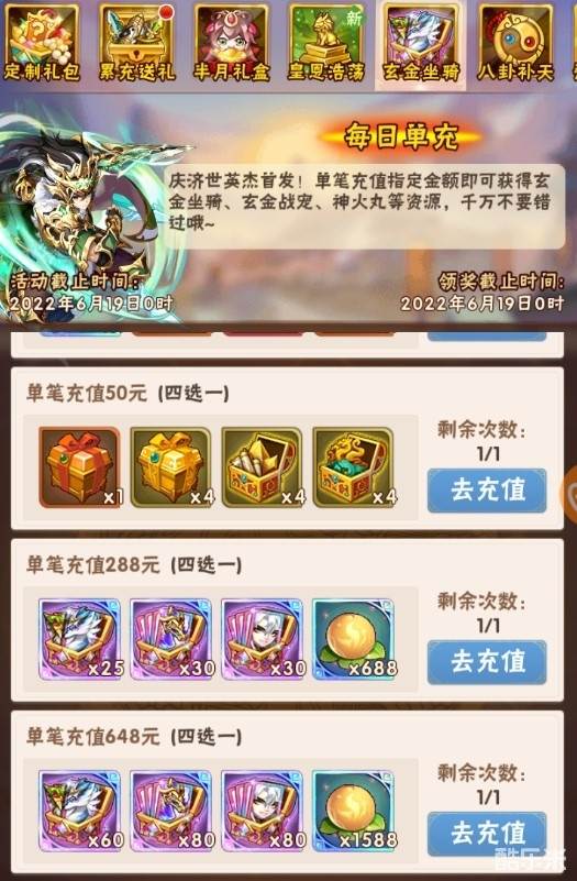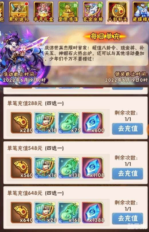 庆济世英杰首发!少年们单笔充值指定金额,即可得到超值八卦令、琉金将、补天玉、神锻石!并且可以和欢庆佳节中的充值活动及其他充值活动叠加,少年们千万不要错过哟~