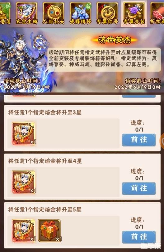 活动期间将任意1个指定济世英杰武将(凤鸣曹婴、神威马超、魅影孙尚香、幻真左慈)升至对应星级即可获得全新玄金将Q萌版变装和专属头像框气泡框好礼!