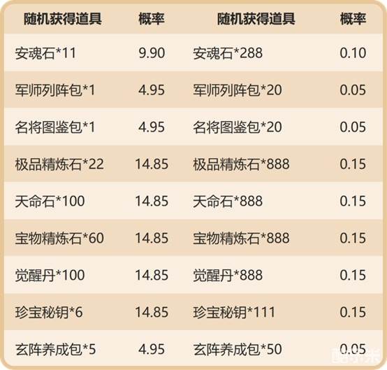 3.「秘宝礼盒」可开出:珍宝秘钥*111、玄阵养成包*50、觉醒丹*888、天命石*888、极品精炼石*888、安魂石*666、军师列阵包*40、名将图鉴包*40、宝物精炼石*888、珍宝秘钥*6、玄阵养成包*5、觉醒丹*100、天命石*100、极品精炼石*22、安魂石*11、军师列阵包*1、名将图鉴包*1、宝物精炼石*60中的随机1种。