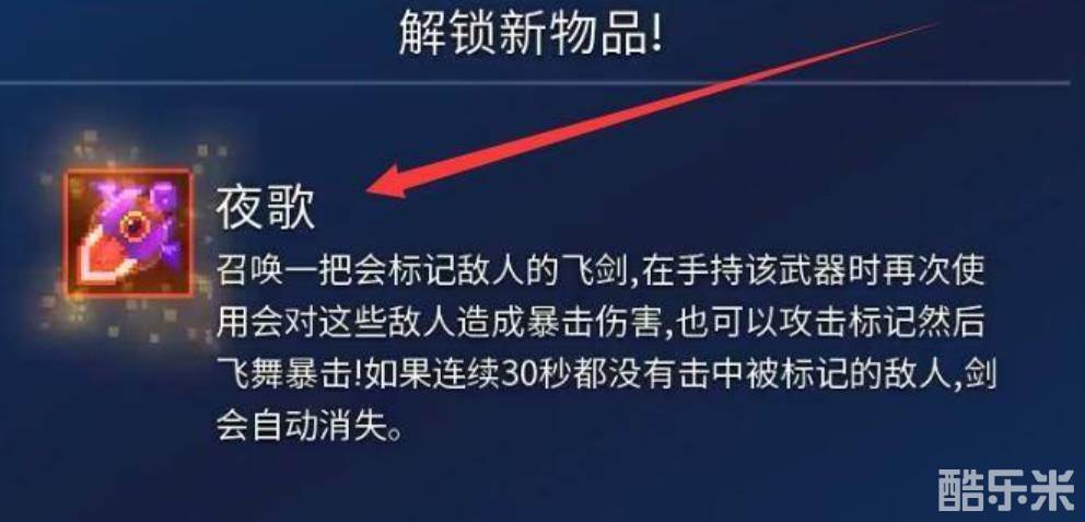 解锁夜歌武器就能用了。召唤一把会标记敌人的飞剑,在手持该武器时再次使用会对这些敌人造成暴击伤害,也可以攻击标记然后飞舞暴击!如果连续30秒都没有击中被标记的敌人,剑会自动消失。