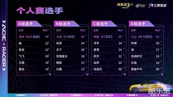 S7车神杯个人赛冠军“大海”、S7车神杯个人赛亚军“栖夏”、外卡赛冠军“凡尘”与人气KOL“无树”也将加入后续赛段的激烈的竞争中,与晋级选手们进行强强对决,究竟最终是王朝再续还是黑马诞生,且让我们拭目以待!