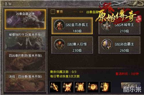 玩法介绍:Boss挑战玩法,具有多个流程,目前开放的是流程1 - 凶兽盘踞之地。玩家可进入四种地图,挑战对应首领Boss获得奖励。