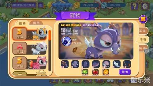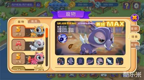 点击培养,会出现喂养的界面。宠物共有7个可进化部位:背饰,身体,眼睛,嘴,四肢,尾巴,角。身体决定种族,宠物共分为6个不同的种族,雪绒、虎斑、绿芒、红麟、紫电、棕缕。头上的角则是宠物的主动技能。使用家园里产出的果实可对宠物进行喂养,每种果实可增长宠物对应的具体属性,宠物增长对应数值的同时获得固定经验值。