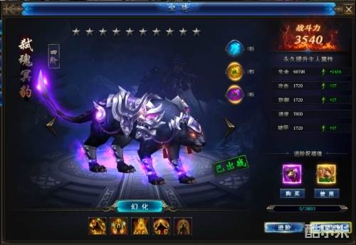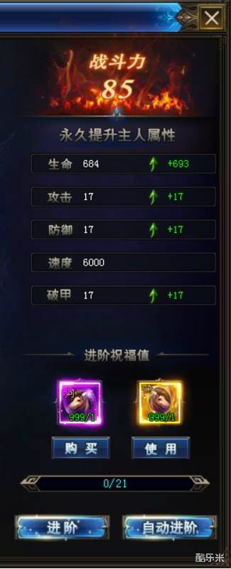 升阶消耗道具:坐骑进阶丹、坐骑祝福卡,每升阶可获得一定范围内的成长值,成长值满时可点亮一颗星,每点亮十颗星可直接升到下一阶,优先使用坐骑祝福卡来进行进阶。
