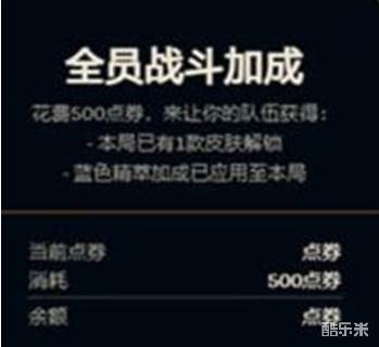 3、具体的效果是,给自己和自己的队友可以解锁随机一款皮肤,但是这个皮肤只能在这个对局中进行使用,对局结束之后,购买全员战斗加成的玩家可以获得200的蓝色精粹的奖励;