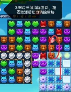 3、贴边三消消除雪块,花团激活后可助力消除剩余雪块