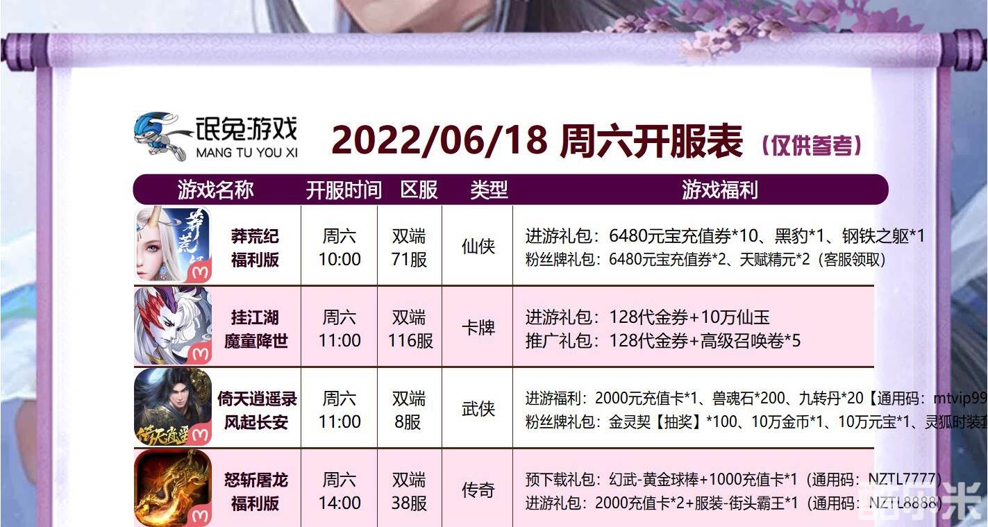 | 莽荒纪-福利版 | 双端71区( 苹果- 安卓) | 2022-06-18 10:00:00 |