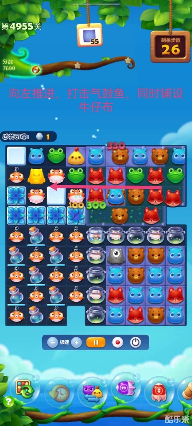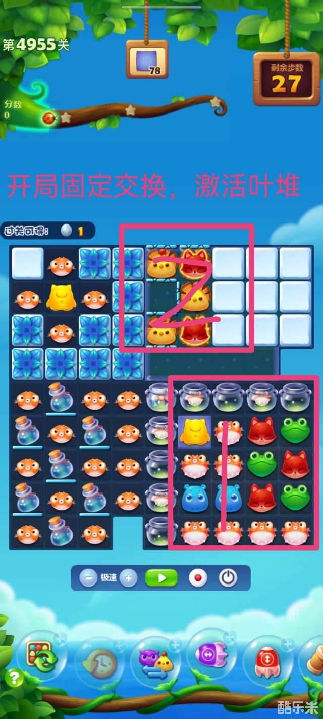 固定开局,左侧向下推进,消除雪层,扩大区域,可以组特效攻击右下方的钥匙或者太阳瓶,让动物掉落,收集钥匙开启箱子区域后,套路,右上角豆荚出现,移动传送带上,左侧掉落,中间松鼠辅助,掉落右侧收集,步数不多,祝福好运!
