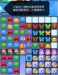 3、贴边三消消除配合留意组合直线、爆炸特效等进行辅助消除,上方小蝴蝶也可助力消除雪块