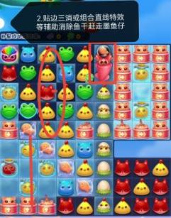 2、贴边三消消除或留意组合直线、爆炸特效辅助,消除小鱼干赶走墨鱼仔,大量小黄鸡散落助力消除