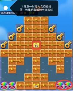1、左、右下角落任意一对魔力鸟交换清屏,收集钥匙解锁宝箱区域
