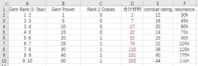 第四列为需要的总材料数,包括了最开始的1级宝石等价的材料。