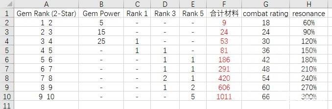 第三列是升级需要的相同宝石的数量,列名为对应的宝石等级,例如5星宝石从9级升级到10级,需要1个三级五星宝石和两个五级五星宝石;