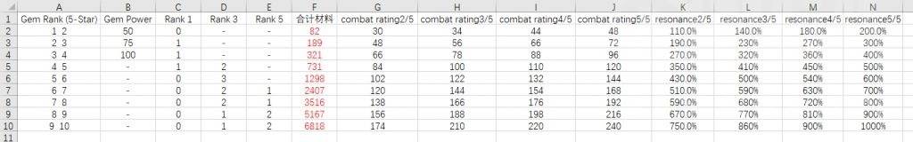 复制了表格,结合服务器里的大佬身上的传奇宝石,做了一个材料总计,添加了 不同星级宝石的战斗等级和共鸣等级的具体数值