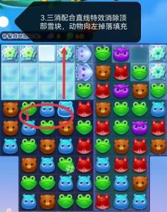 3、三消消除,并留意组合直线特效等进行辅助消除,赶走冲刺鱿鱼并消除雪块,动物可掉落并对空地位置进行填充