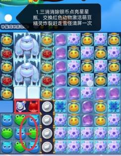 1、三消消除银币点亮星星瓶,星星瓶交换红色动物可激活萌豆精灵炸裂,赶走雪怪清屏消除一次