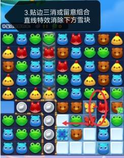 3、贴边三消消除雪块,可留意周边组合直线特效等进行辅助消除下方雪块