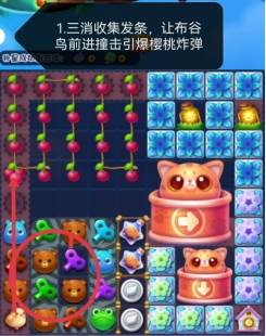 1、三消收集发条,让布谷鸟前进撞击引爆樱桃炸弹,小动物掉落填充,贴边击打赶走小猫咪