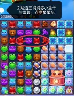 2、贴边三消消除小鱼干与雪块,点亮星星瓶
