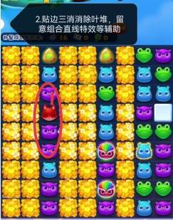 2:贴边三消消除叶堆,同时留意周边组合直线、爆炸特效进行辅助消除