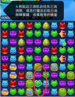 4:有贴边三消消除蜂蜜罐机会时优先三消消除蜂蜜罐,我可击打魔法石助力消除蜂蜜罐,最后配合直线特效等辅助收集散落的蜂蜜
