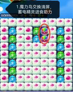 1、魔力鸟交换清屏消除云团,蓄电精灵进食再次消除,完成清屏向下拉图